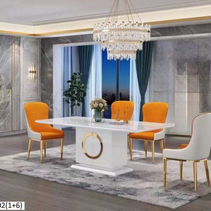 Apportez une touche de luxe et d’élégance à votre intérieur avec cet ensemble salle à manger composé d’une table rectangulaire en bois laqué blanc et de six chaises design bicolores (blanc et orange). Ce mobilier raffiné se distingue par ses lignes modernes, ses finitions dorées et son confort exceptionnel.