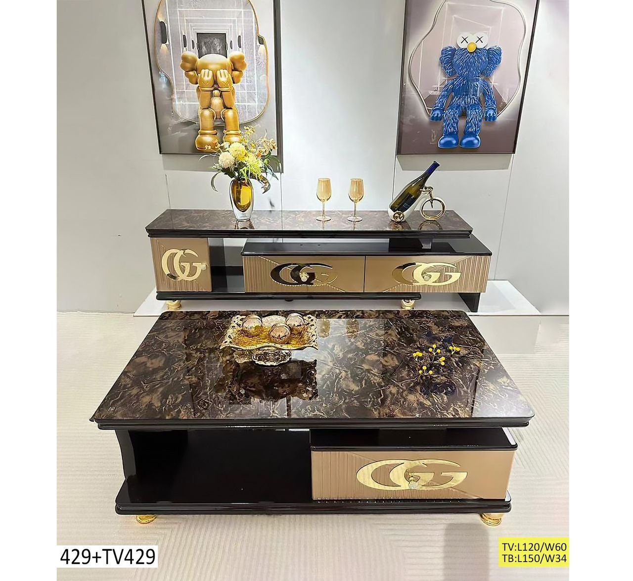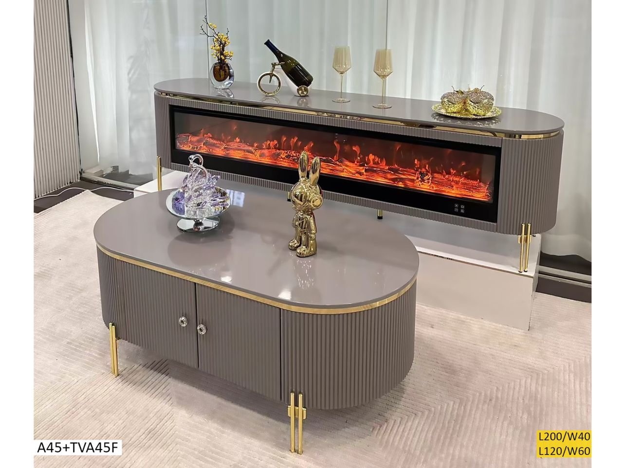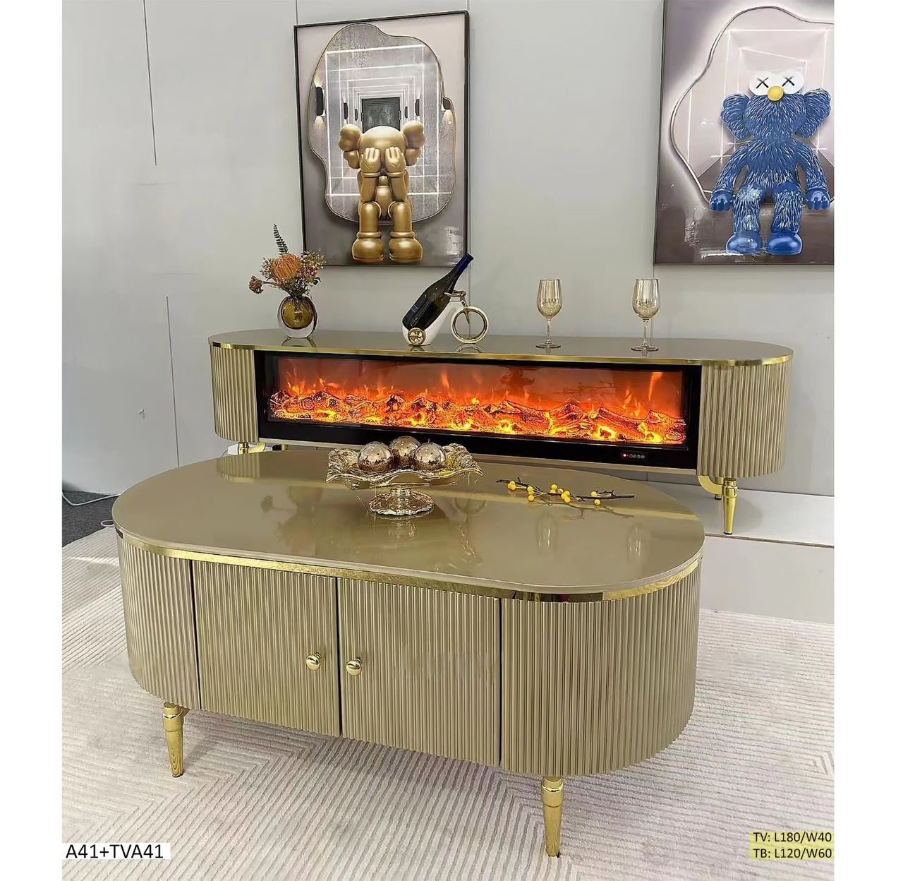 Meuble TV avec cheminée décorative intégrée + Table basse assortie – Design luxueux doré